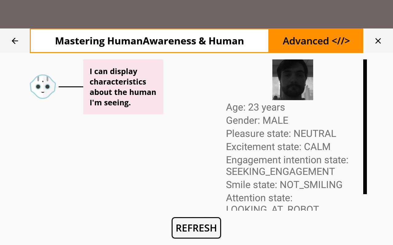 | You should see the log traces “1 human(s) around.” and then your characteristics, including the distance between you and the robot and your face picture. | |